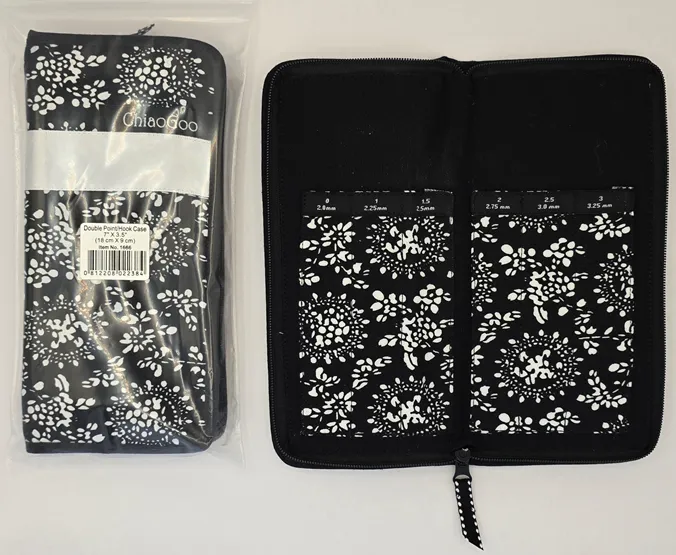 This compact, cotton-fabric case has six inside pockets to hold 6″ (15 cm) double points or crochet hooks. The case opens book style with a complete zipper enclosure. It has a small zippered pocket on the outside for notions. Closed case dimensions are 3 1/2″ (9 cm) x 7″ (18 cm).