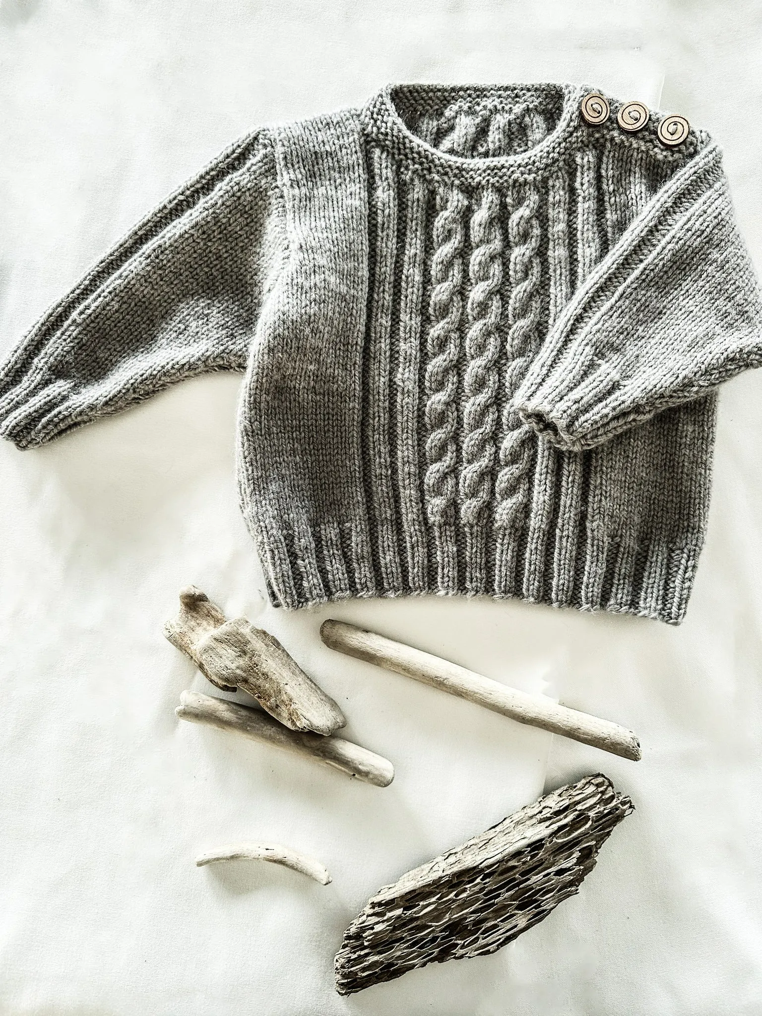 The Whitley Sweater and Hat by lisafdesign is knitted from soft 5ply merino yarn. The sweater features a simple combination of 2×2 ribbing and cable patterns, enhanced by ribbed details, a classic crew neck and buttoned opening for a comfortable fit. The matching hat features a folded brim, for extra warmth.